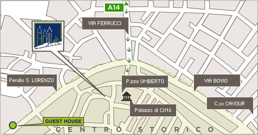 ArtèAndria B&B is situated in the city centre and it is easily reachable. From A14 Motorway, Highway S.S 16 Bis or the Andria orbital highway, just take the straight way Via Barletta – Via Ferrucci until you get to the Town Hall (Piazza Municipio). The B&B will be on your right.For updated navigation systems the physical address of the B&B is: Via Mura S.Francesco, 16 – Andria (BA)